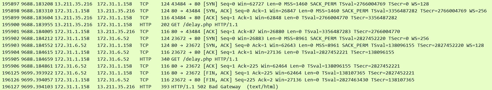 This is how it looks like on pcap. I used AWS VPC Traffic Mirroring feature to capture traffic on the ENIs created by the ALB so its easy to see the front-end (client side) and the back-end (server side) connections together. We can see the client side connection coming in and then ALB trying to establish a connection to one of the targets and receiving a TCP RST straightaway.