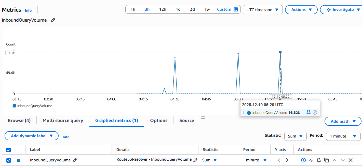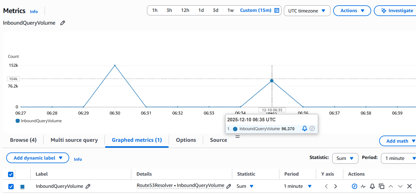 2. Check Query Volume and Capacity using the below CloudWatch metrics. The public documentation says that each ENI can take upto 10,000 UDP queries per second but this figure depends on certain factors like type of query, size of the response, health of the target name servers, query response times, round trip latency, and the protocol in use (UDP vs TCP). This figure is also affected by Connection Tracking. To remove Connection Tracking from the equation simply add Inbound and Outbound rules allowing TCP/UDP port 53 from 0.0.0.0/0 on the Security Group associated to the Inbound Endpoint. (Check the Load Testing section below)