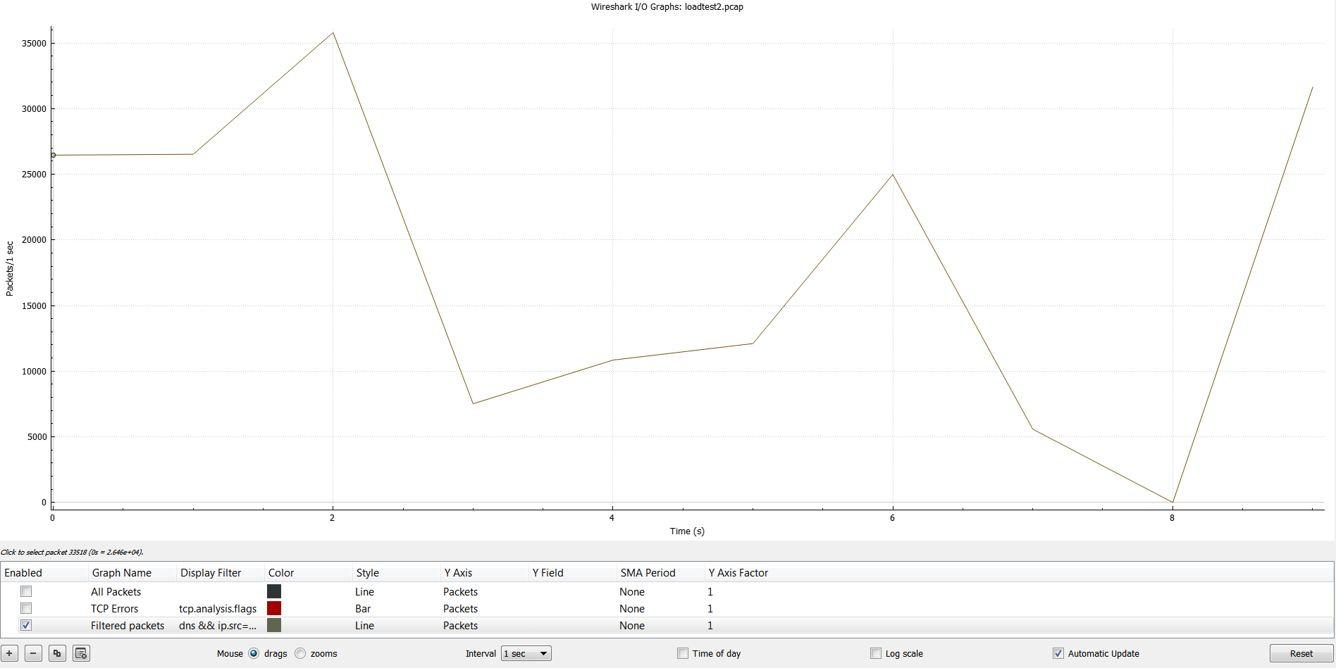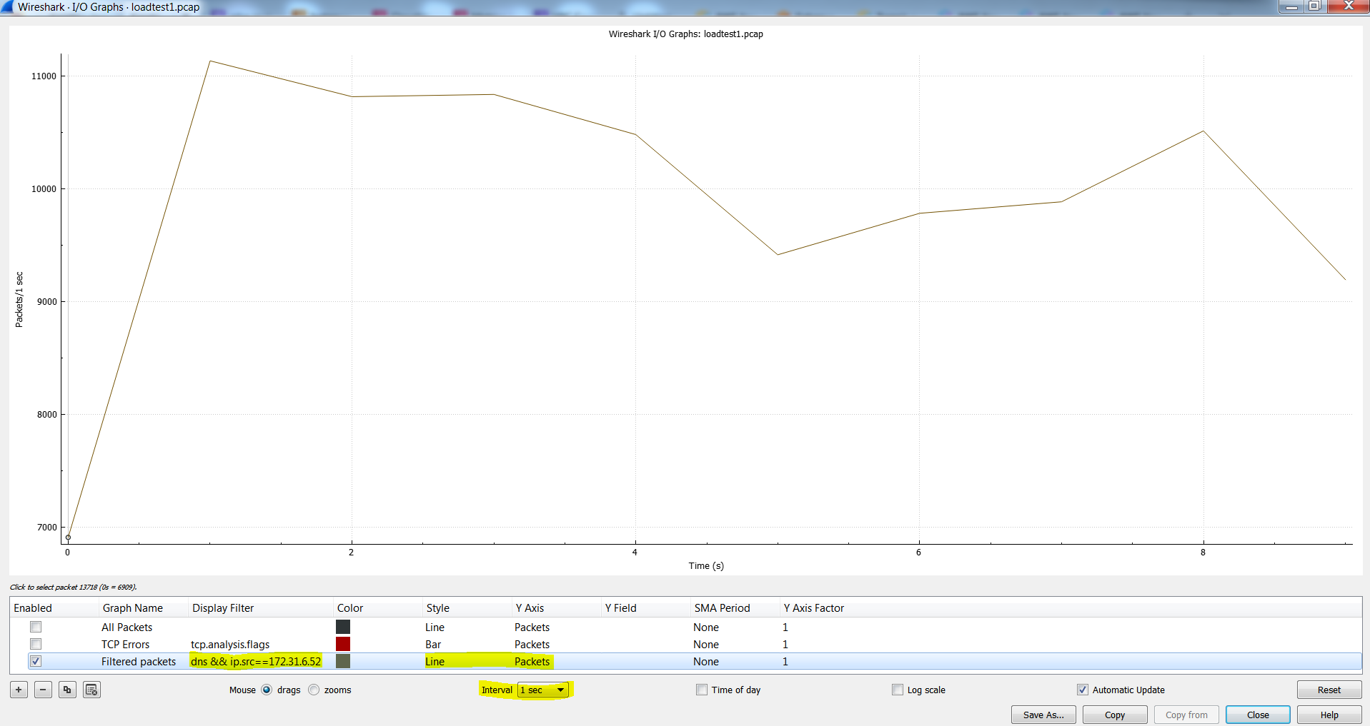 You may do 98826 / 60 = 1647 qps which is well below the limit of 10000 qps but that's like assuming we got 1647 qps uniformly for all the 60 seconds of the minute whereas all these queries took place within 10 seconds and there was 0 query volume during the rest of the 50 seconds. So we need to rely on other tools to see the per second view like pcaps or Route 53 VPC Resolver Query Logging. Here is a pcap taken on the client where the load was generated: