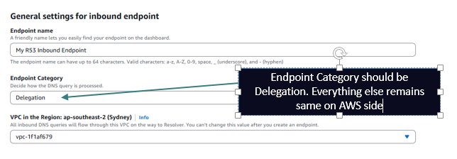But now you can create a delegation on your parent zone hosted on the on prem server as depicted above for a subdomain hosted in a AWS PHZ. This means that the Inbound Endpoint should support Iterative Queries so now you need to setup the Inbound Endpoint as Delegation type as shown below: