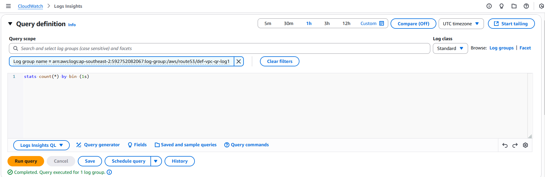 Now this time we can see the tool sent a much higher load i.e 181417 queries as compared to 98971 queries from the previous test. Out of these 103754 failed (timed out) and 77663 succeeded with a query rate of 6414 qps. I did see close to 9500 qps as well in my testing but the main point is that this time we let the load generator push a higher per second concurrent load and we can see that the endpoint was not able to keep up. In the below screenshot we can see CloudWatch and Resolver Query Logs only recorded ~96000 queries but the Wireshark capture taken on the load generator shows the per second distribution of the 181417 queries that were sent. So this clearly shows that Route 53 endpoint was not able to handle that higher than 10000 qps volume.