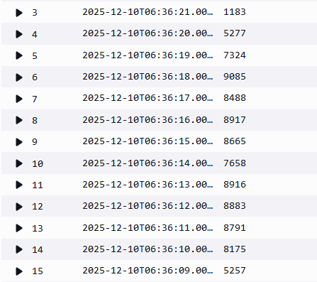 As you can see no queries were lost and we achieved a qps of 9867. Question is why did we achieve this result close to the 10000 qps limit. To answer this we need to understand how the load generator generates the load - Did it uniformly send 1000 concurrent queries per second for 10 seconds? Looking at Cloud Watch metrics is not enough to see the per second view. The most granular you can go is 1 minute SUM and the below screenshot shows a figure of 98826 for the 1 minute period at 05:20 at which the test was run.
