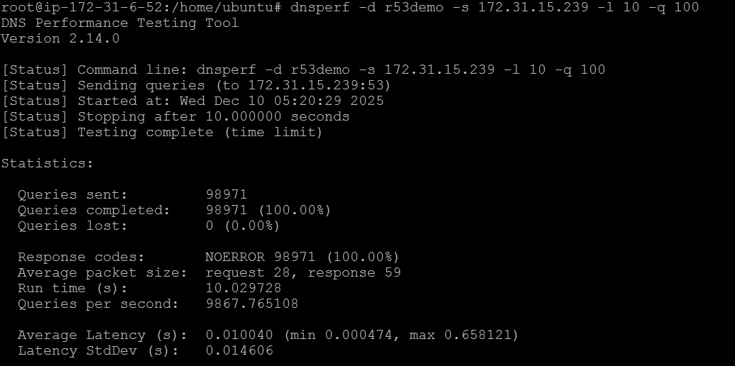 dnsperf -d r53demo -s 172.31.15.239 -l 10 -q 100