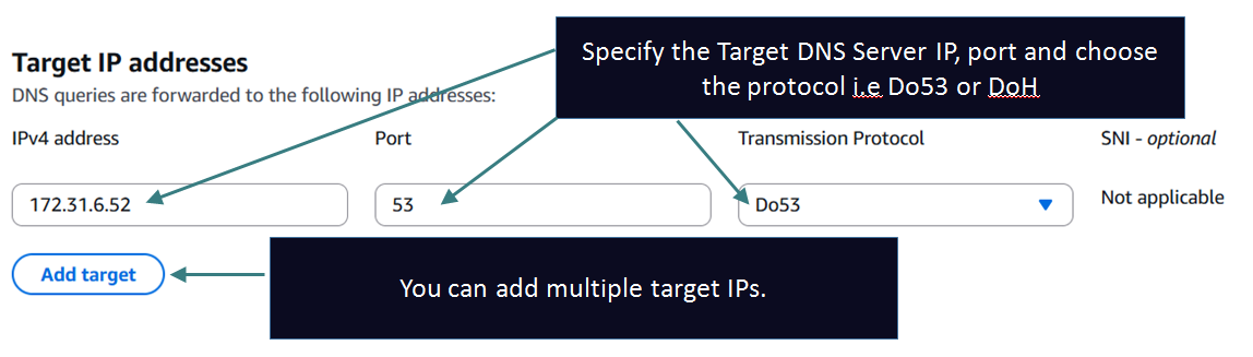 4. Outbound Endpoints retry + timeout behavior: The Outbound Endpoint randomly chooses an ENI and a target IP (if several target IPs are defined) to forward the query. If a target IP does not respond the query is retried to another random target IP. Make sure that all the target IP addresses are reachable from all the ENIs. If the Endpoint is not able to forward queries to any of the target IP, it can lead to extended DNS resolution times as the previous query will timeout before a new query is sent.