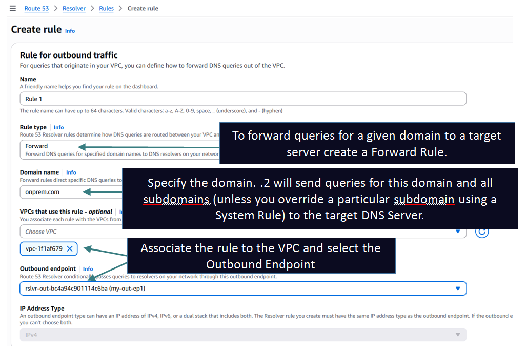 Forward Rules: If you want to forward queries for a particular domain to a target DNS server you need to create this type of rule. A forwarding rule applies to a domain name and all its subdomains. For example if you create a forward rule for onprem.com then .2 will forward all queries for onprem.com and all its subdomains i.e *.onprem.com to the target DNS servers through the Outbound Endpoint.