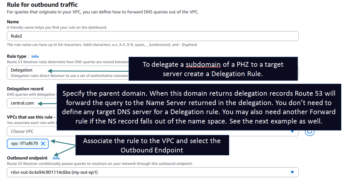 1. Rules for Private Hosted Zones: For each private hosted zone that you associate with a VPC, a forward rule is created for the domain name and associated with the VPC. The query is forwarded by .2 to the Authoritative Name Servers of the PHZ