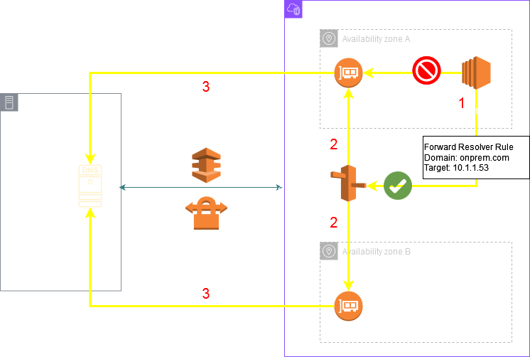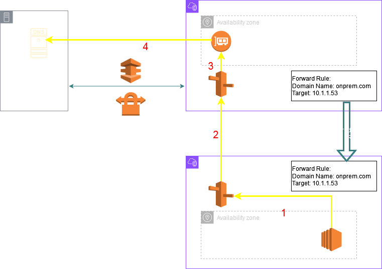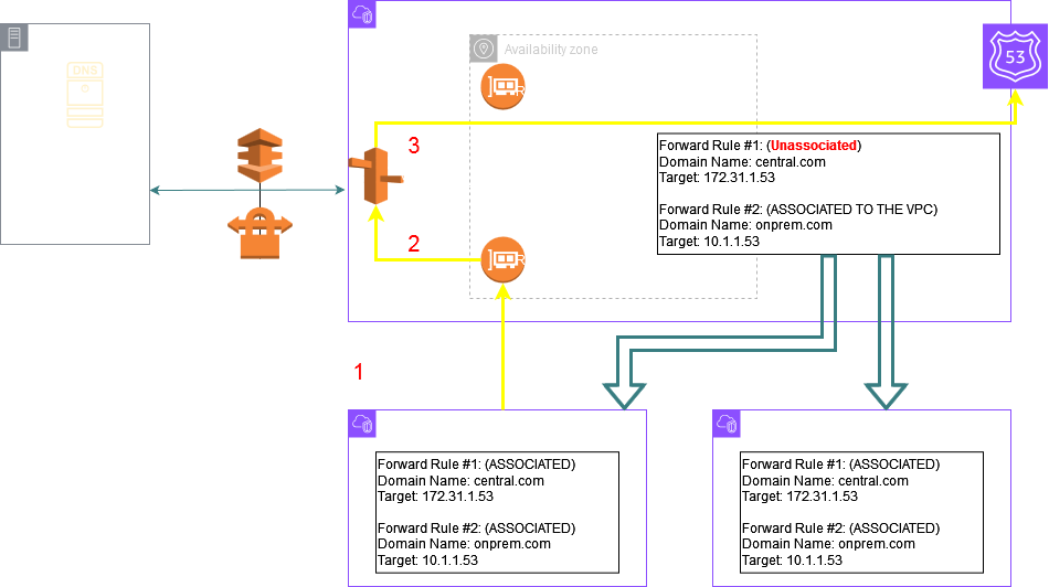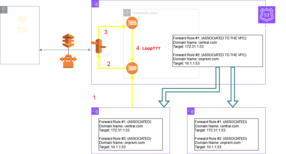 The mistake is associating this rule with the central VPC. As a thumb rule if the target of a rule is the same VPCs Inbound Endpoint IP you should not associate the rule to the same VPC. The purpose of this rule is to bring the queries from the other VPCs to the central VPC. This rule once shared to the other spoke VPCs should be associated to those spoke VPCs but it should be left unassociated to the central VPC otherwise it will cause a loop as depicted in the below picture Step 4 where the query is again forwarded from the Outbound Endpoint to the Inbound Endpoints IP following the Resolver Rule.
