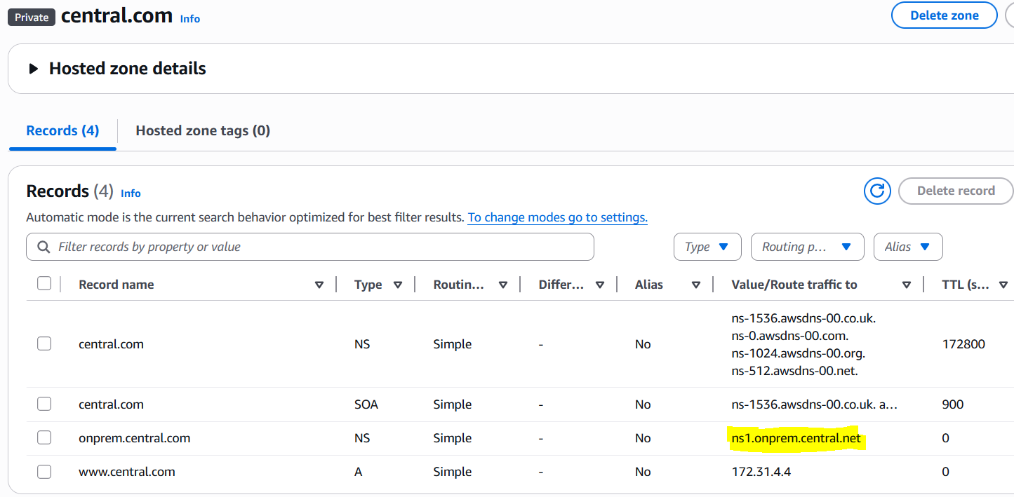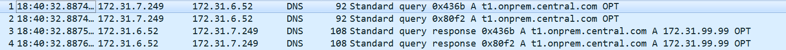 [root@ip-172-31-2-118 ec2-user]# dig t1.onprem.central.com; <<>> DiG 9.18.33 <<>> t1.onprem.central.com;; global options: +cmd;; Got answer:;; ->>HEADER<<- opcode: QUERY, status: NOERROR, id: 48723;; flags: qr rd ra; QUERY: 1, ANSWER: 1, AUTHORITY: 0, ADDITIONAL: 1;; OPT PSEUDOSECTION:; EDNS: version: 0, flags:; udp: 4096;; QUESTION SECTION:;t1.onprem.central.com. IN A;; ANSWER SECTION:t1.onprem.central.com. 60 IN A 172.31.99.99;; Query time: 9 msec;; SERVER: 172.31.0.2#53(172.31.0.2) (UDP);; WHEN: Wed Dec 10 18:40:32 UTC 2025;; MSG SIZE rcvd: 66