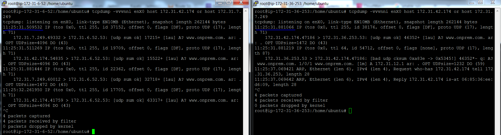 Packet capture from both target servers below. The one on the left shows that the queries kept coming in and there was no reply (thanks to our Iptable rule). Note the timestamp of the 1st query received by the old server: 11:25:31.509532. This query was not answered and hence the query was retried to both the servers. The new server on the right received its 1st query at 11:25:31.881066 which is after 372 milliseconds and this delay is reflected in the DIG output.