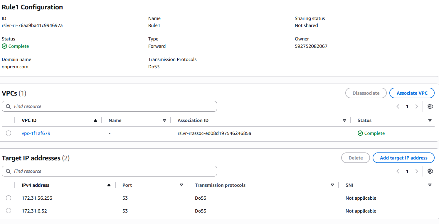 - Make sure that the Resolver Rule (local or shared) is associated to the intended VPC.