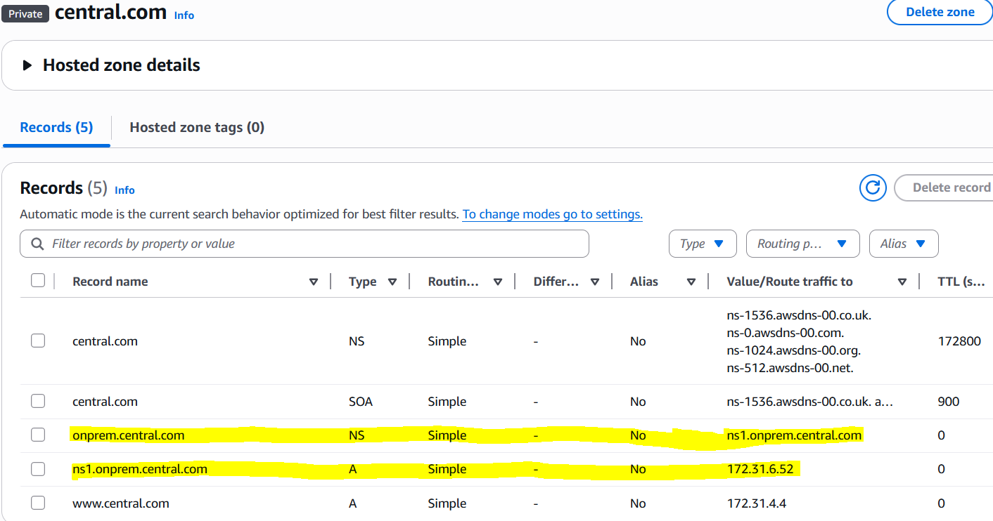 I then set an Authoritiative Zone for onprem.central.com on my custom BIND server 172.31.6.52.