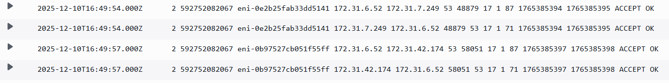 Note that the query was sent from each RNI to the target DNS server. This is reflected in the VPC Flow logs as well, however the Resolver Query Log logs this as a single query because the client after all just sent 1 query. Its just that the Endpoint ENIs/RNIs send duplicate queries to the target DNS server. I will explain this behavior later in the article.