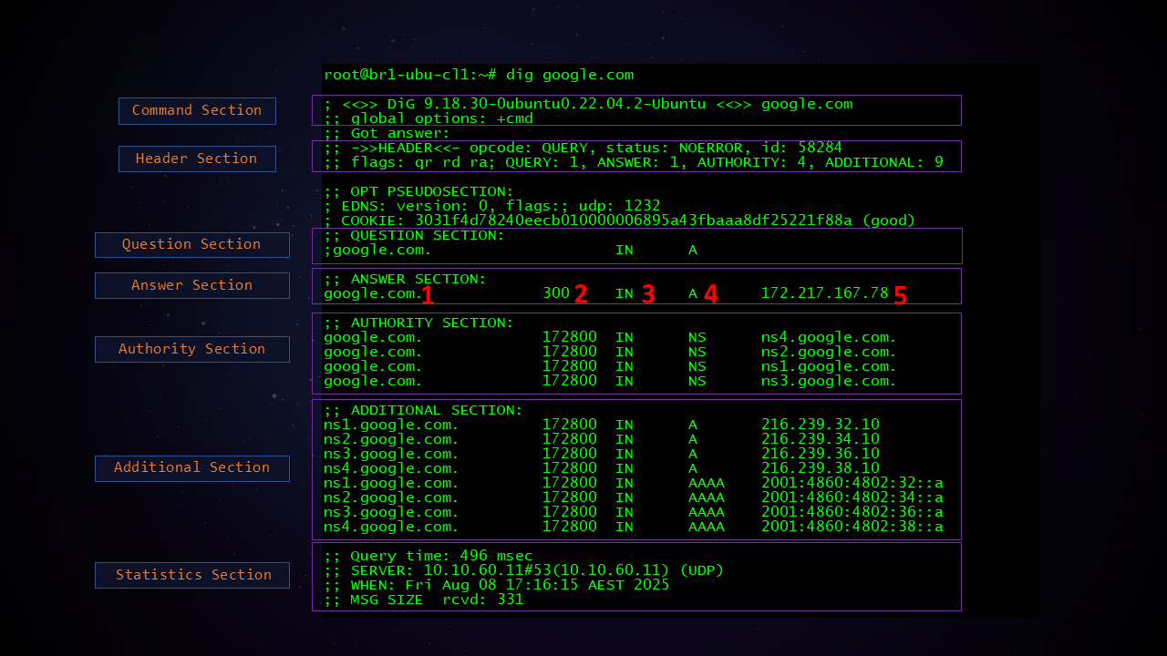 Answer Section: Displays the answers to the DNS query. This is the main section. It contains the DNS Resource Records which make up the response from the server. The fields are explained below.