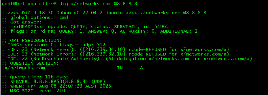 - The Resolver received an invalid response from any of the Servers it is reaching out to during the recursion process like in the image below the Resolver received a REFUSED status code from the Authoritative Servers for x7networks.com as indicated in the OPT PSUEDOSECTION section of the output. Google's 8.8.8.8 and CloudFare's 1.1.1.1 very recently started adding this information to provide a hint as to why the Resolver is returning a SERVFAIL. The REFUSED status indicates something wrong with the Authoritative Name Servers of the domain - either they are incorrect or not ready.